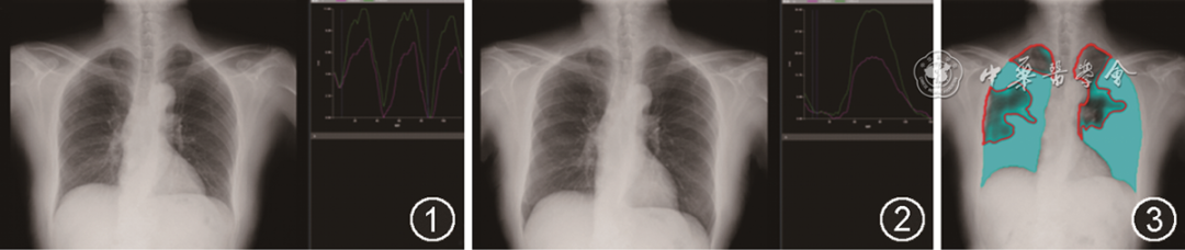 图3 例1患者动态X线胸片(2023年2月21日)可见肺通气显像双肺灰色区域占双肺的39%