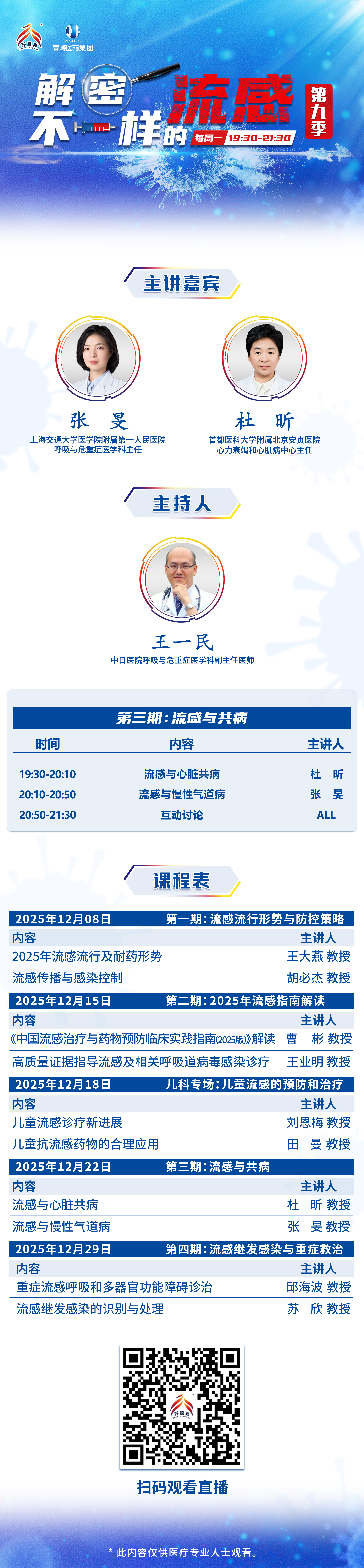 2025年12月8日19:30起,王大燕、胡必杰、曹彬、王业明、刘恩梅、田曼、张旻、杜昕、邱海波、苏欣教授等(以演讲时间为序)深 耕流感诊治、防控的专家将在《呼吸界》“解密不一样的流感”系列直播间, 围绕