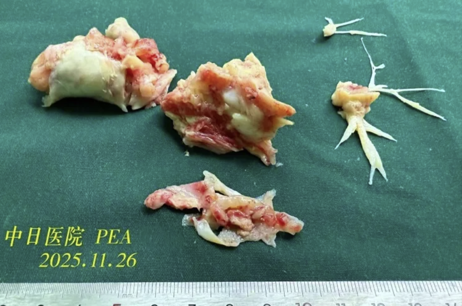 治疗:2025年11月26日行肺动脉肉瘤剥脱术,手术切除病灶标本如下图: