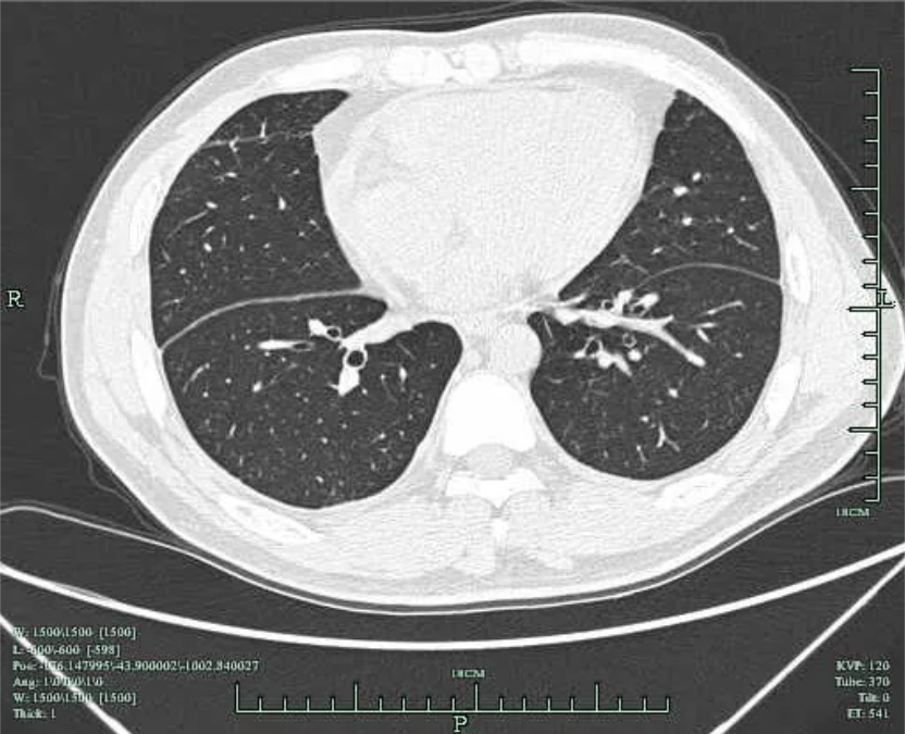 住院过程中,追问患者为面馆老板,否认食用生鱼、醉虾、醉蟹等,回忆起患病前1周曾有一次修理摩托车过程中遭低压(220V)电击,当时有左侧胸痛,全身麻刺感,随后隐约觉得左侧胸痛,刺痛或隐痛,未重视;此次入院后经抗感染、胸水引流、心包积液引流等处理,复查胸水明显减少,心包积液减少,约半年随访复查肺部CT 两肺未见实质性病灶(图5),未见胸腔积液,未见心包积液,故此次胸腔积液及心包积液考虑低压电击后心肌损伤,胸部钝挫伤、血胸可能。