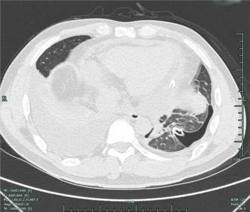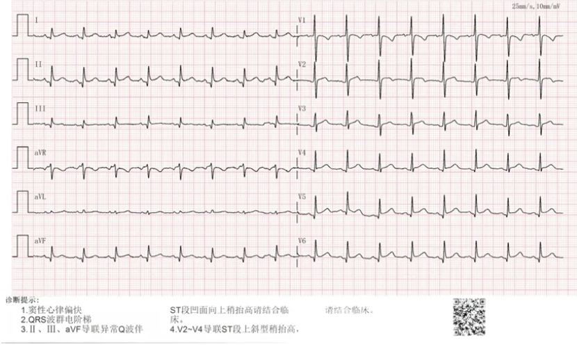 患者3周(2022年10月10日)前出现左前胸及侧胸疼痛,呈阵发性隐痛,能忍受,疼痛无放射性,否认疼痛时黑曚、汗出、否认畏寒发热等,社区医院用药(具体药名不详)后好转;1周前(10月23日)左侧胸部出现压榨痛,疼痛呈持续性不能缓解,伴胸闷气急,至县医院就诊:血常规:白细胞 11*10^9/L(3.5-9.5*10^9/L),血红蛋白及血小板正常;超敏C反应蛋白:67.95mg/L(0.00-3.30mg/L),心电图示:V2-V5导联ST段凹面向上稍抬高(图1);10月24日肺部CT示(图2):左肺散在炎症,左侧胸腔少量积液伴邻近肺组织膨胀不全,两肺散在纤维灶,心包积液,升主动脉增宽;10月24日心超示:三尖瓣反流,左室舒张功能减低,心包积液(心尖部心包分离约0.5cm),心动过速,EF:57%。