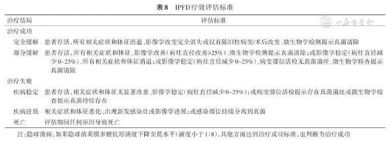 IPFD的疗效需要结合临床症状、体征、实验室检查及影像学结果进行综合评估。抗真菌治疗通常较抗细菌起效慢,有效者多在1~2 周后临床症状和体征才开始改善,此时可初步进行疗效评估;重症应动态评估。疗效评估结果分为治疗成功(完全缓解、部分缓解)和治疗失败(疾病稳定、疾病进展、死亡)[32,34](表8)。