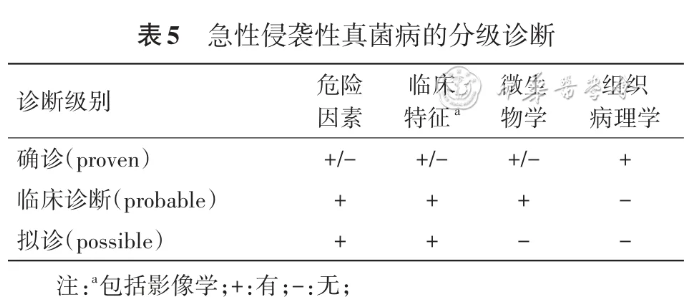 拟诊(possible):具备至少1项危险因素(表2)、1项临床特征(表3),但无微生物学证据。为了避免过度诊治,免疫功能正常的非重症患者建议在确诊和临床诊断后再启动抗真菌治疗,而异基因造血干细胞移植、实体器官移植、CAR-T治疗、血液肿瘤患者拟诊可启动治疗。