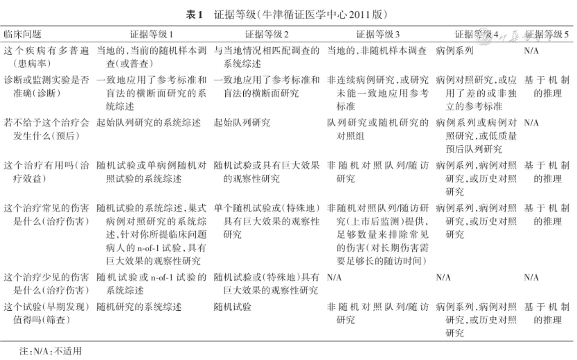 本指南通过专家会议讨论筛选临床问题,着重探索肺真菌病的诊断与治疗。检索PubMed、Embase、Cochrane Library及CNKI数据库,检索时间截至2025年6月21日,采用牛津循证医学中心(OCEBM 2011)分级[6]评价证据质量,分为5个级别:1级(高质量)、2和3级(中等质量)、4和5级(低质量)(表1),同时辅以定性研究质量评价——关键质量评估技能项目(critical appraisal skills program,CASP)清单评估研究可靠性。综合考虑证据质量、利弊平衡、患者偏好、干预措施的可行性与可及性,形成推荐意见。所有推荐意见需经指南专家组成员不少于75%表决通过,不对推荐强度予以区分,有分歧时采用德尔菲法修改,并重新投票以达成共识。