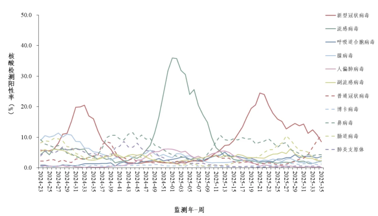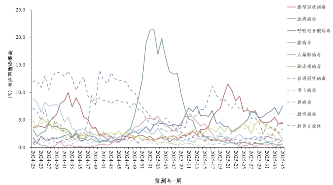 2025年第35周(2025年8月25日—8月31日),对全国哨点医院(不含港澳台)采集的门急诊流感样病例和住院严重急性呼吸道感染病例的呼吸道样本,开展新型冠状病毒、流感病毒、呼吸道合胞病毒、腺病毒、人偏肺病毒、副流感病毒、普通冠状病毒、博卡病毒、鼻病毒和肠道病毒等10种病毒以及肺炎支原体在内的多种呼吸道病原体检测。