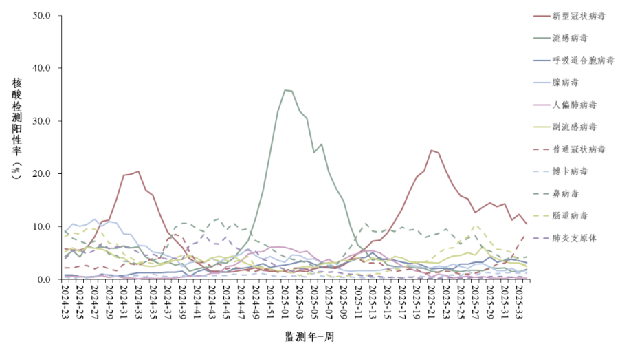 2025年第34周(2025年8月18日—8月24日),对全国哨点医院(不含港澳台)采集的门急诊流感样病例和住院严重急性呼吸道感染病例的呼吸道样本,开展新型冠状病毒、流感病毒、呼吸道合胞病毒、腺病毒、人偏肺病毒、副流感病毒、普通冠状病毒、博卡病毒、鼻病毒和肠道病毒等10种病毒以及肺炎支原体在内的多种呼吸道病原体检测。
