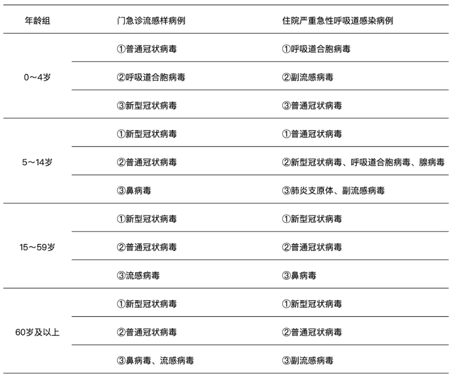 - 住院严重急性呼吸道感染病例呼吸道样本检测阳性率前三位病原体为呼吸道合胞病毒(6.2%)、普通冠状病毒(4.4%)、新型冠状病毒(4.3%)