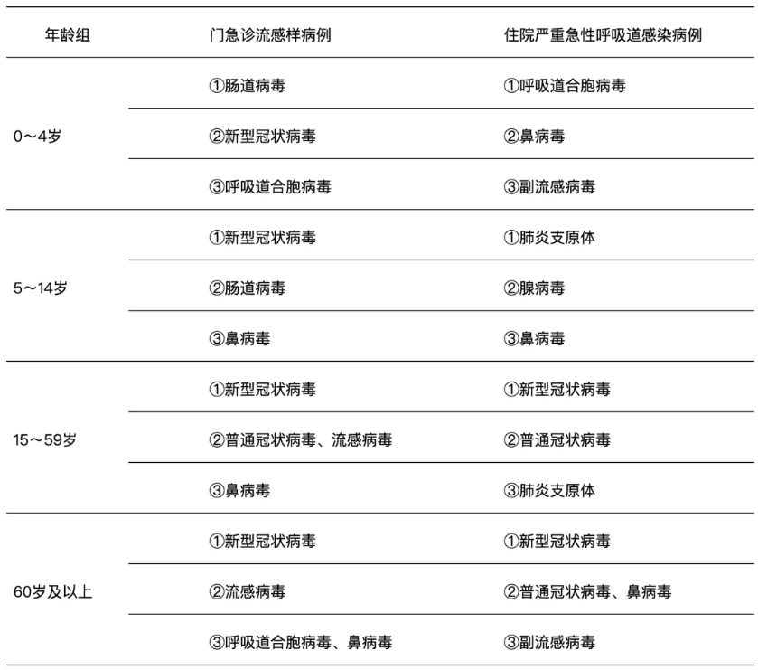 - 哨点医院门急诊流感样病例呼吸道样本检测阳性率前三位病原体为新型冠状病毒(13.6%)、肠道病毒(5.7%)、鼻病毒和呼吸道合胞病毒(均为3.8%);