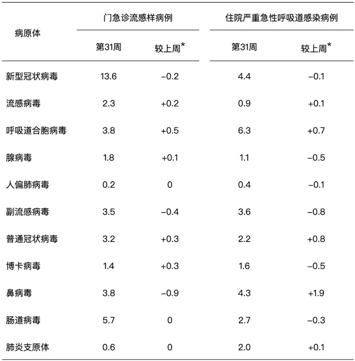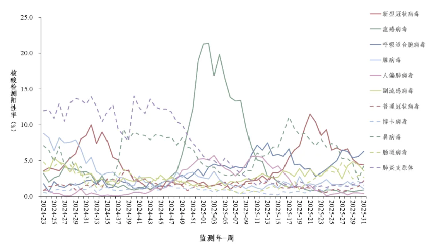 2025年第31周(2025年7月28日—8月3日),对全国哨点医院(不含港澳台)采集的门急诊流感样病例和住院严重急性呼吸道感染病例的呼吸道样本,开展新型冠状病毒、流感病毒、呼吸道合胞病毒、腺病毒、人偏肺病毒、副流感病毒、普通冠状病毒、博卡病毒、鼻病毒和肠道病毒等10种病毒以及肺炎支原体在内的多种呼吸道病原体检测。