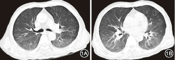 入院体检:心率106 次/min,血压157/114 mmHg(1 mmHg=0.133 kPa),外周指脉氧饱和度94%(文丘里面罩氧浓度31%支持),双肺呼吸音粗,心律齐,腹软,双下肢轻度可凹性水肿;时间定向力、计算能力差,双上肢肌力5级,下肢肌力3+级。入院后完善辅助检查:血气分析(吸入氧浓度37%):pH值为7.45,PaCO2为20 mmHg,PaO2为66 mmHg,cHCO3-为18.1 mmol/L,cLac为6.1 mmol/L;LDH为2 573 U/L;铁蛋白 1 641 ng/ml;白细胞介素(interleukin,IL)-10为134.0 ng/L。自身抗体谱:抗核抗体斑点型阳性,滴度1˸320;抗中性粒细胞胞质抗体(antineutrophil cytoplasmic antibodies,ANCA)核周型阳性,滴度1∶20。胸部CT示双肺弥漫性磨玻璃样病变,呈重力分布(图1)。