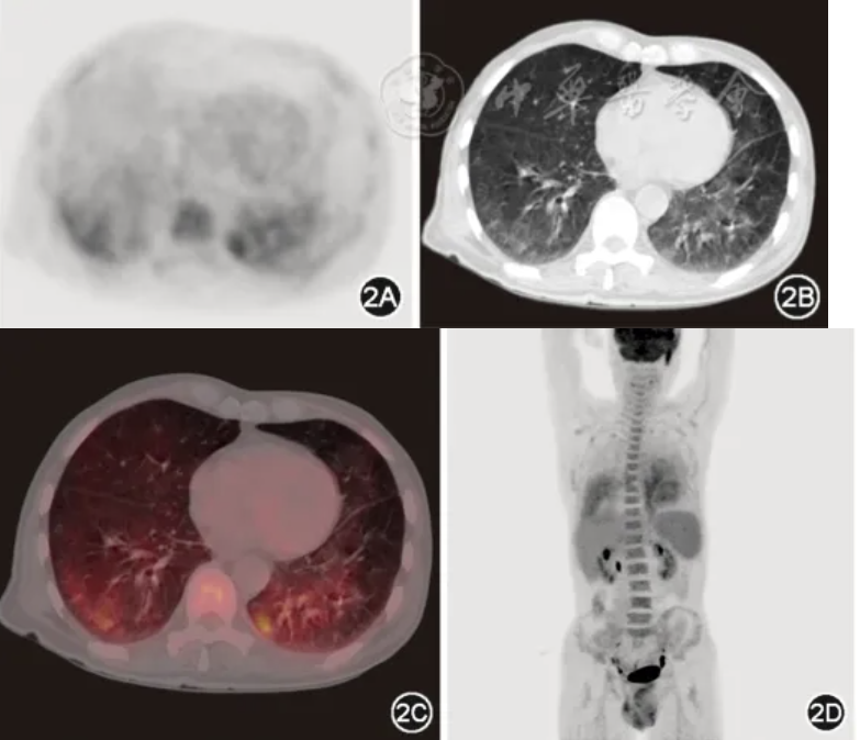 图2 患者2023年8月8日PET/CT检查,其中图2A为PET-CT胸部横断位图像,图2B为同机器的胸部CT图像,图2C为融合图像,图2D为全身最大密度冠状位投影图,可见双肺广泛分布的磨玻璃密度影,放射性摄取增高,SUVmax值为5.5,分布呈重力依赖性