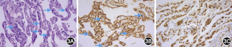 图3 患者右肺下叶基底段TBLB病理学检查结果显示:图3A箭头所示小血管及肺泡间隔毛细血管内见较多异型淋巴细胞 HE染色 低倍放大;图3B箭头所示肿瘤细胞位于血管腔内 CD34免疫组织化学染色 低倍放大;图3C血管腔内异型细胞为B细胞来源 CD20免疫组织化学染色 低倍放大